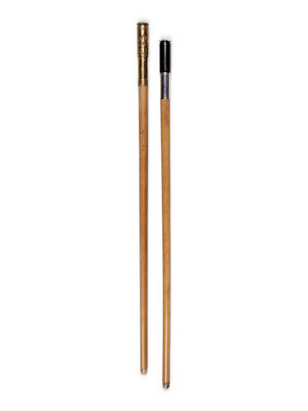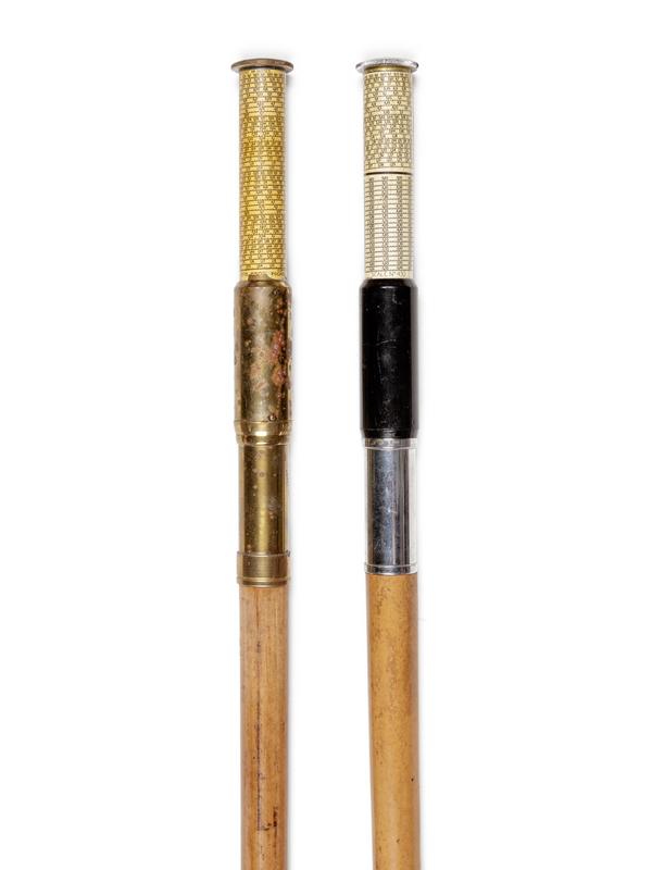 Two English Metal Mounted Otis King Pocket Calculator System Walking Sticks