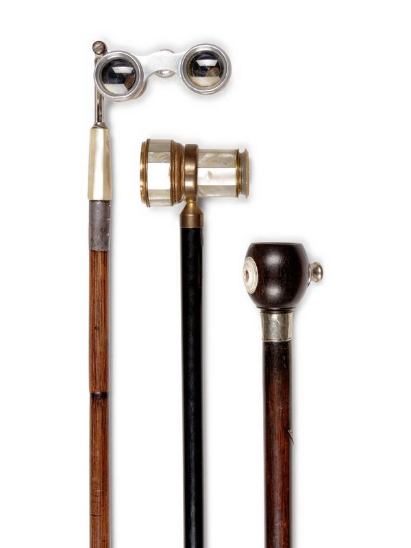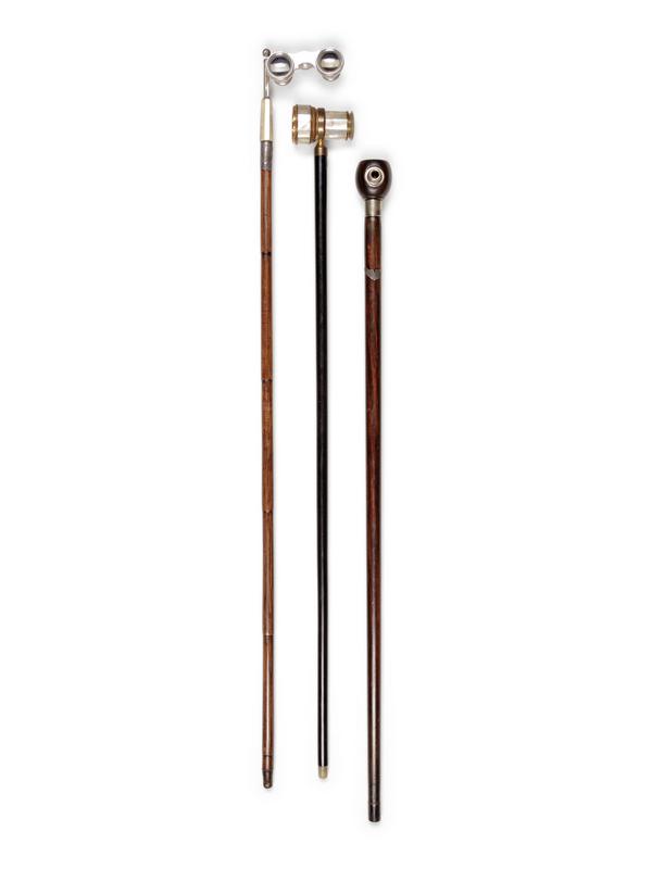 Two Mother-of-Pearl and Brass Mounted Opera Glass Mounted Walking Sticks
