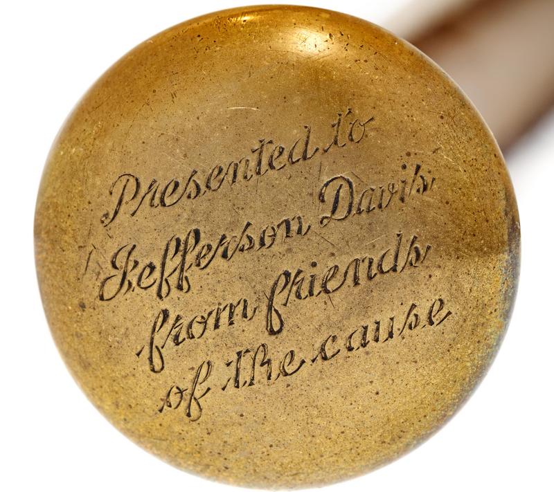 the brass handle engraved Presented to/ Jefferson Davis/ from Friends/ of the Cause with a hardwood shaft ending in a metal ferrule.