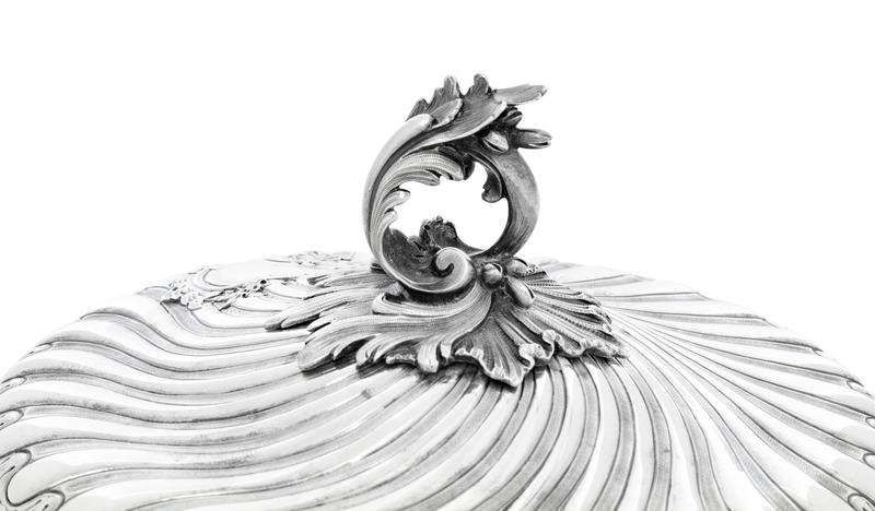 the foliate form finial above the twist-fluted lid with a vacant cartouche among floral sprays.