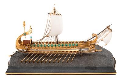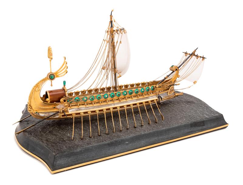 A German 18-Karat Yellow Gold, Rock Crystal, Enameled, Diamond, Emerald and Sapphire Inset Model of a Roman Galley