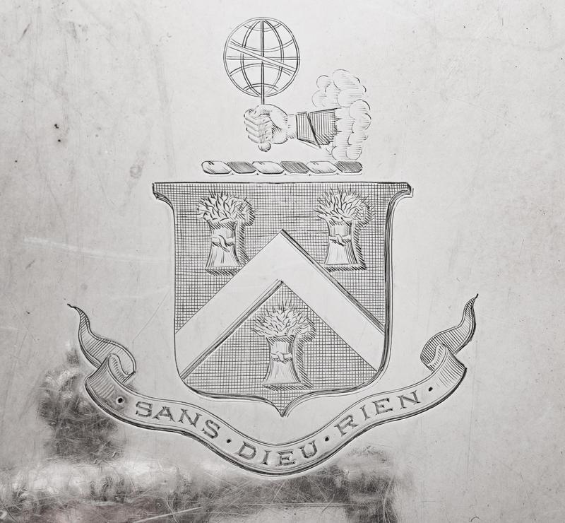 comprising a water kettle-on-stand, teapot, coffee pot, covered sugar bowl, creamer, waste bowl and a serving tray, each bearing an engraved crest above the motto Sans Dieu Rien.