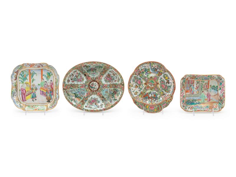 comprising a Rose Medallion oval platter and serving dish and a Rose Mandarin floriform plate, together with two associated square plates.