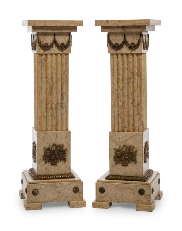 A Pair of Louis XVI Style Gilt Metal Mounted Marble Pedestals