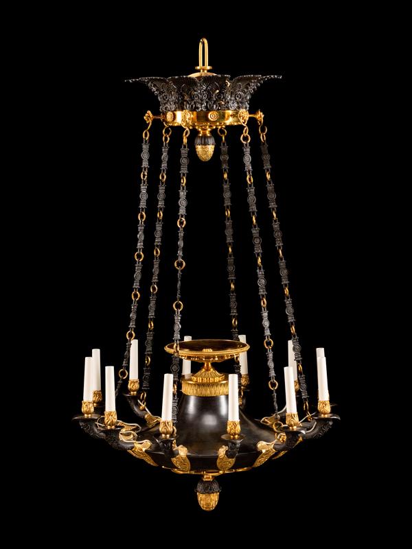 An Empire Style Gilt and Painted Metal Twelve-Light Chandelier