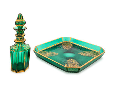 A Continental Green Glass Tray and Decanter