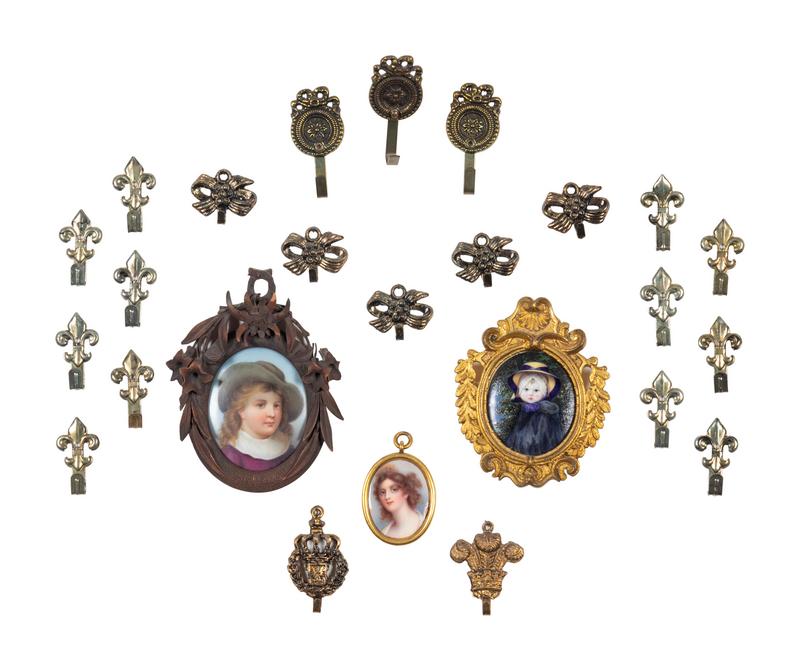 comprising two examples on porcelain and one enameled example, together with 22 miniature hanging hooks.