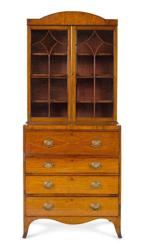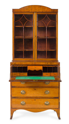 in two parts, the domed cornice above two glazed doors with mullions opening to three shelves, the base fitted with a fall-front opening to a baize-lined writing surface and a fitted interior, further over three graduated long drawers, raised on splayed feet.