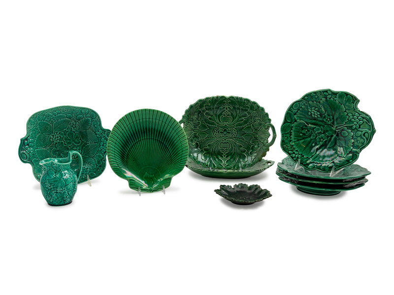 comprising a pair of platters, 4 plates, a berry bowl, a shell-form dish, a leaf-form dish and a creamer.