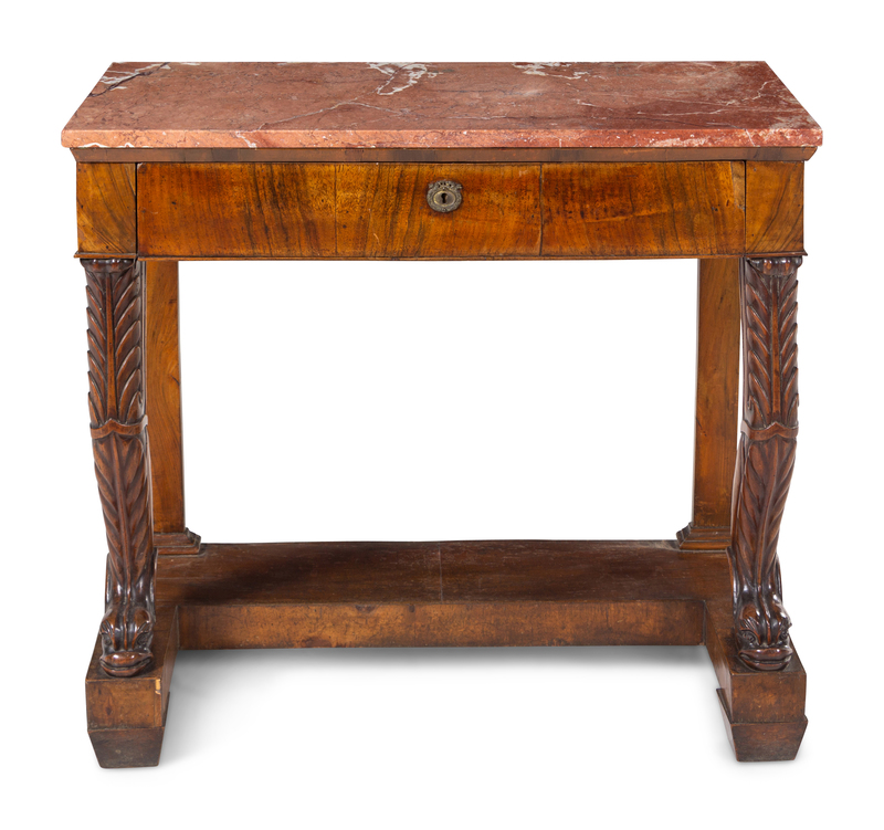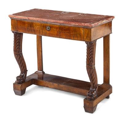 A Neoclassical Figured Mahogany Marble Top Console Table