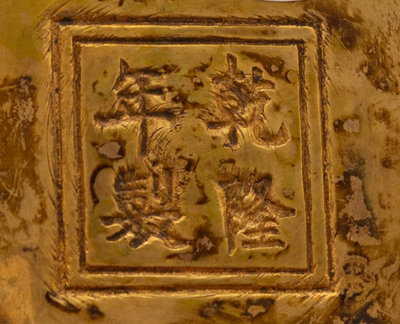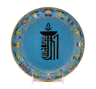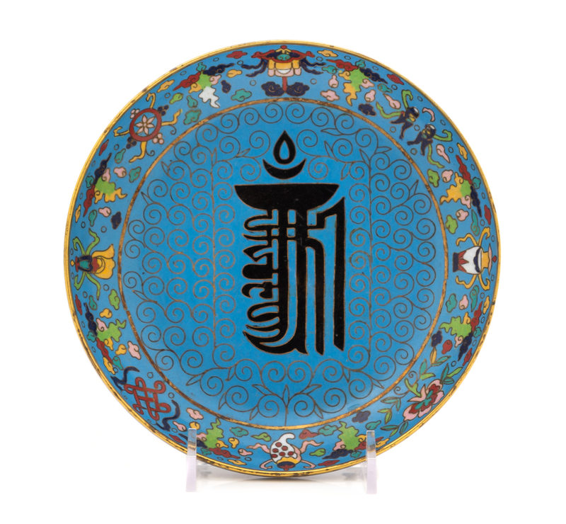 centered with a black enameled Sanskrit character within a border of Buddhist emblems, the underside bearing an apocryphal Qianlong four-character mark.