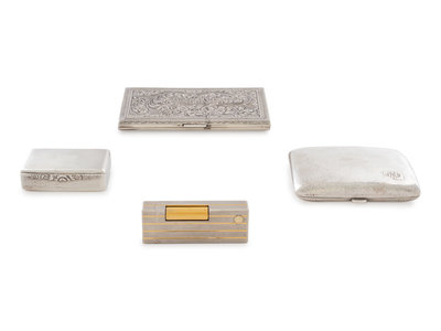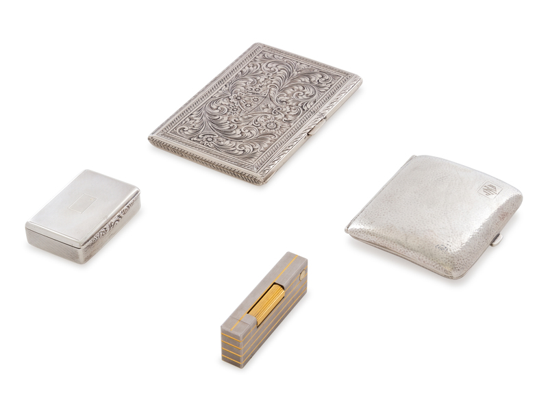comprising an American silver cigarette case marked for Watrous Mfg. Co., Wallingford, CT; a German example and an English silver snuff box marked for Dingley Bros., Birmingham, 1978, together with a Dunhill lighter.