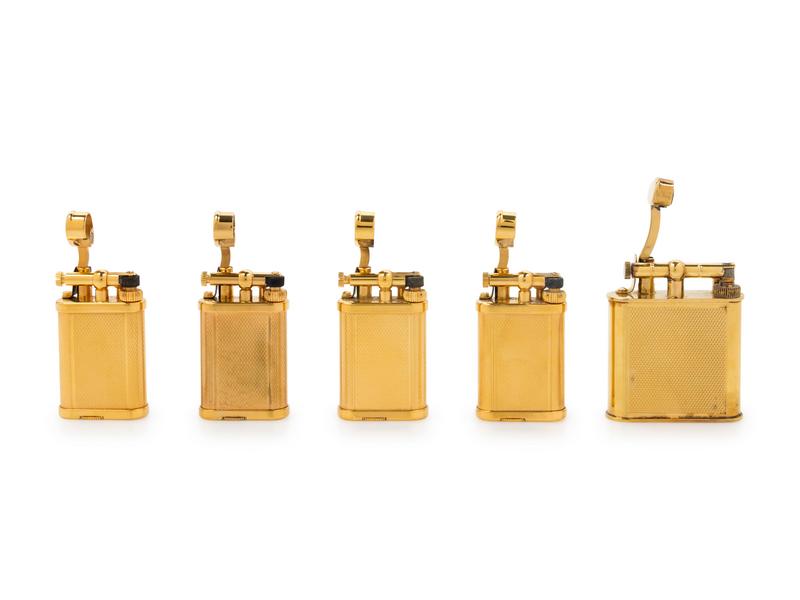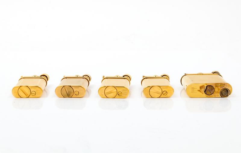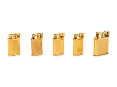 A Group of Five Gilt Metal Dunhill Lift-Arm Lighters