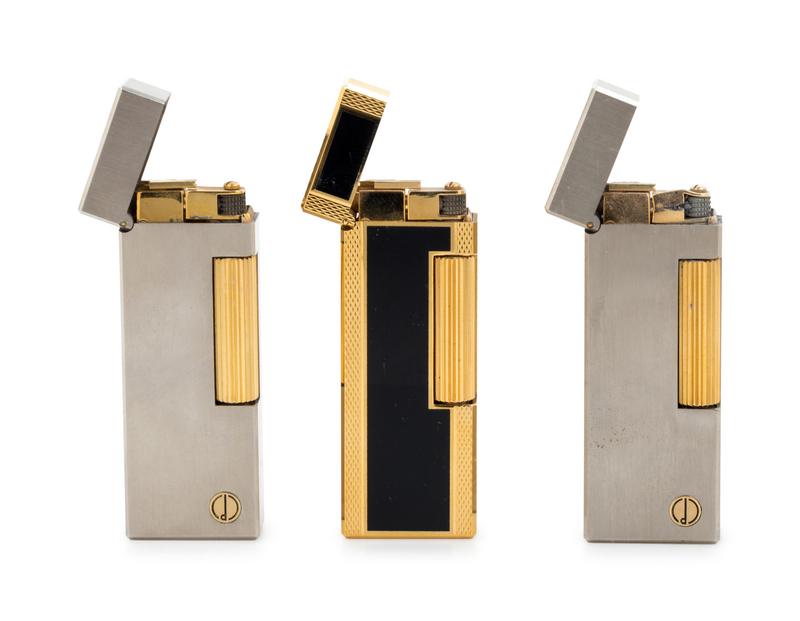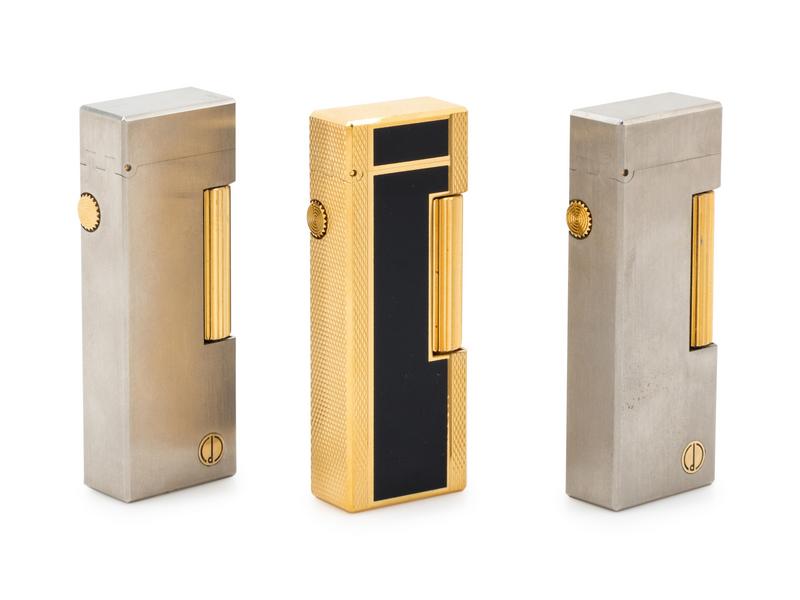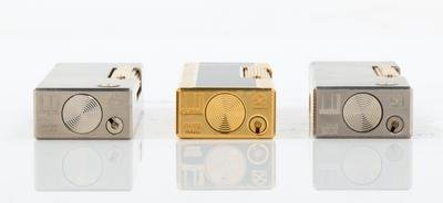 comprising two examples with a brushed metal case and a gilt metal example with enamel sides.