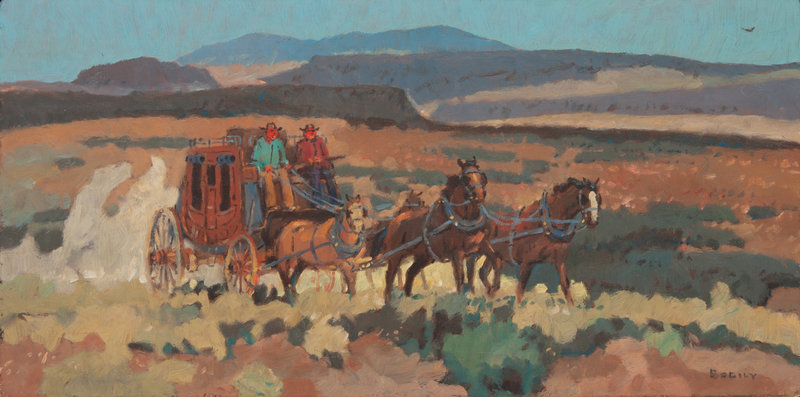 Stagecoach, oil on board, signed Bodily (lower right)