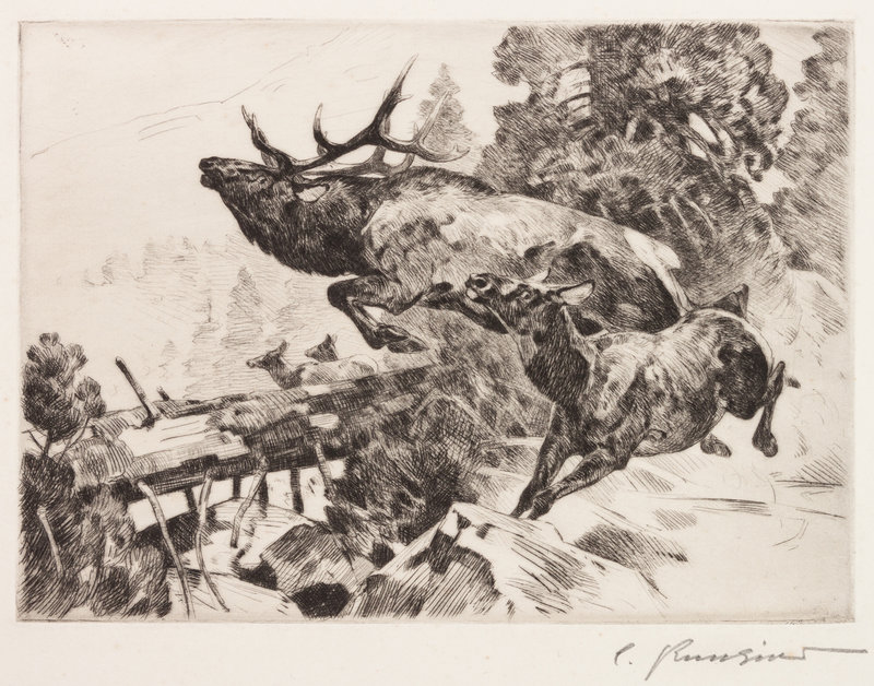 Stampede, drypoint on paper, signed C. Rungius (lower right)
