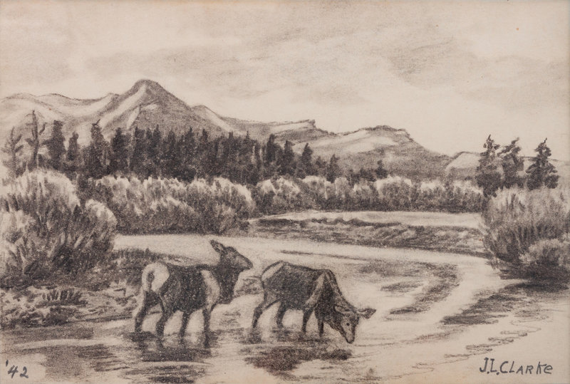Deer with Mountains, 1942, charcoal on paper, signed J.L. Clarke (lower right)