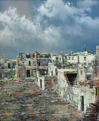 Mishongnovi, mixed media on canvas, signed P.A. Kotony (lower left)