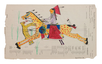 Warrior Fighting Cougar, watercolor on ledger paper, signed Michael Horse (lower right)