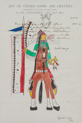 Taunts Enemy, watercolor on ledger paper, signed Michael Horse (lower right)