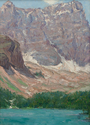 Moraine Lake, Alberta, With One of Ten Peaks, 1956, oil on panel, signed M.A.Y. Offley, titled and dated (verso)