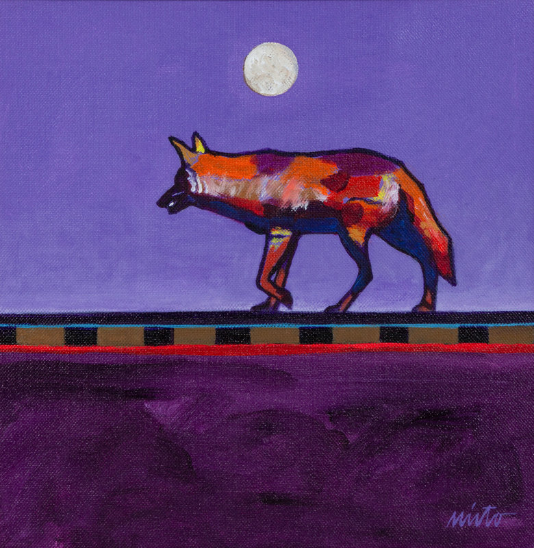 Coyote Walking on Railroad Track, 2014, acrylic on canvas, signed Nieto (lower right)
