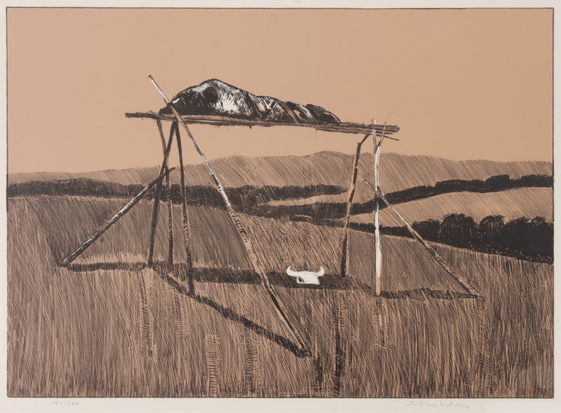 Burial at Mouse River, edition 49/100, 1979, lithograph, signed Scholder (lower right) and numbered (lower left)