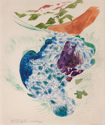 Waterfall in Mountain Landscape, 1947, watercolor on paper, signed Herbert Bayer and dedicated (lower left) and dated (lower right)