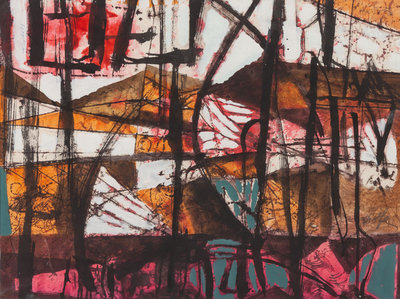 Pink and Orange Mountain Abstract, watercolor on paper, signed Lynne Wolfe (upper right) and Wolfe (upper left and lower right)