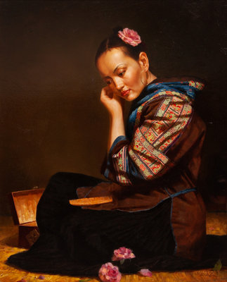 Wearing the Earrings, oil on board, signed Jie Wei Zhou (lower right)