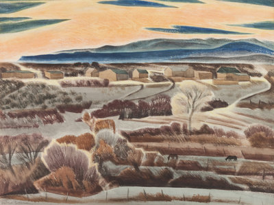 Winter Sunset, watercolor on paper, signed Barbara Latham (lower right)