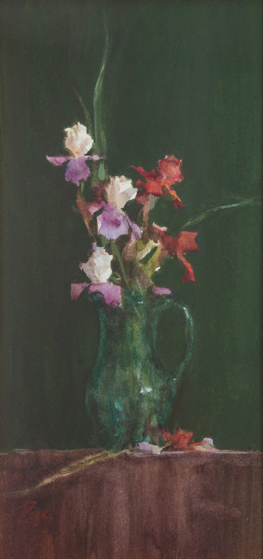 Pitcher with Iris, watercolor on paper, signed Robb (lower left)