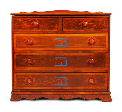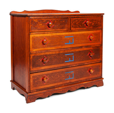Three Drawer Pine Chest, with routed polychrome whirling log and ranch brand designs, original paint and finish, circa 1935