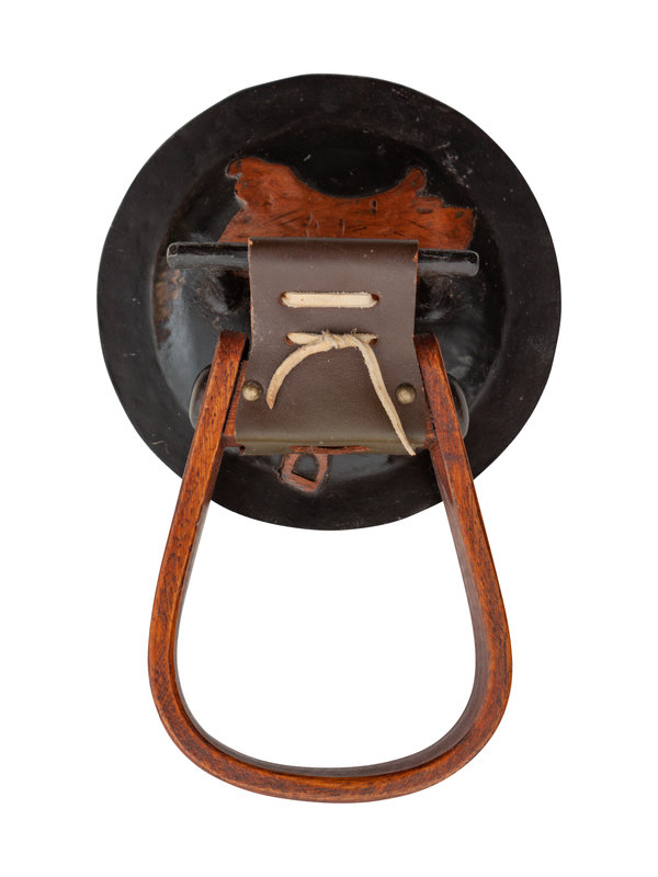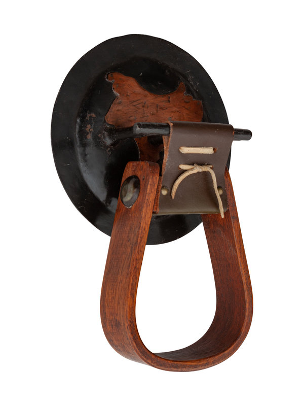 Saddle Wall Sconce, the fixture suspended inside a wooden stirrup, with wrought steel back plate and an applied copper, circa 1937