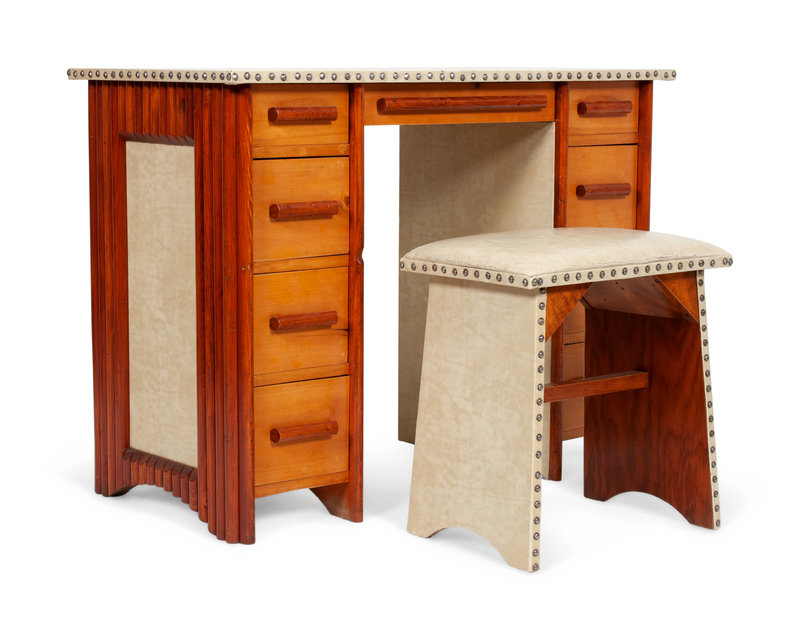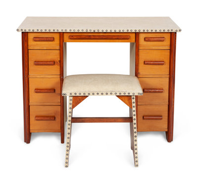 Dressing Table, with seven drawers, half pole trim on sides and original white leather, together with matching bench and leather wrapped mirror, circa 1945