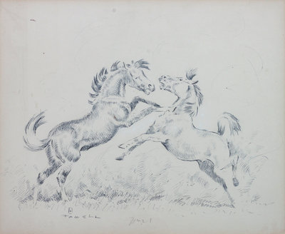 Fighting Stallions, ink on paper, signed Powell (lower left)