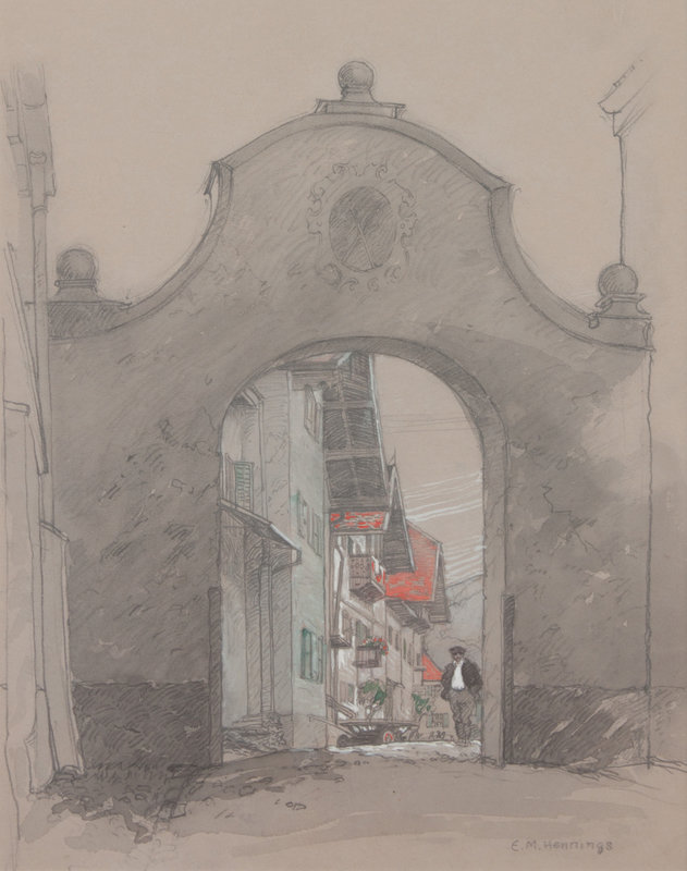 Untitled, Street Scene, gouache on paper ,signed E.M. Hennings (lower right)