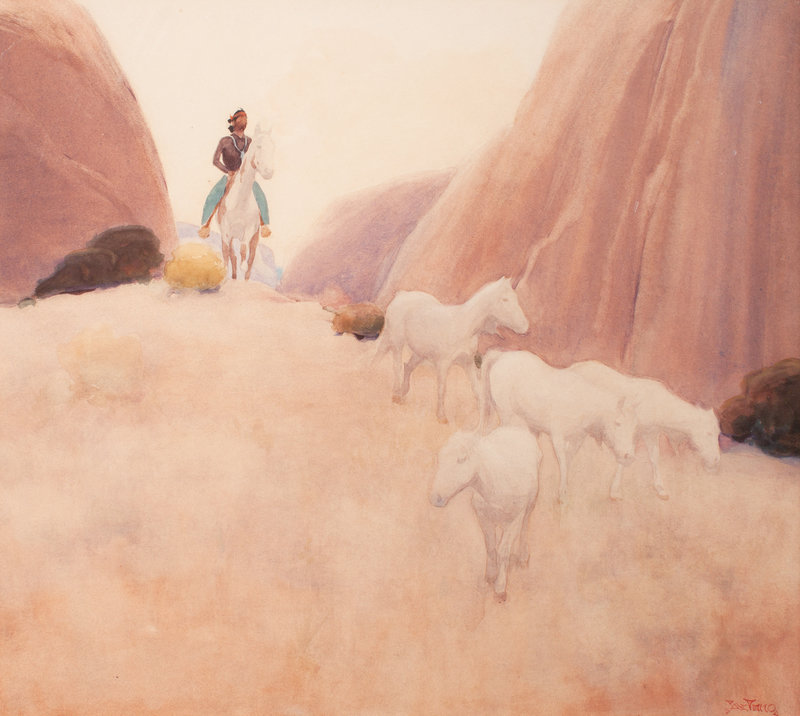 White Ponies (Navajo), watercolor on paper, signed Delano (lower right)