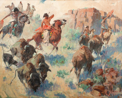 Buffalo Hunting, oil on canvas, signed V. Stiha (lower right)