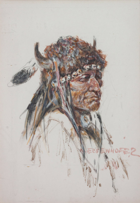 Indian with Horned Headdress, watercolor and pen on paper, signed Eggenhofer (lower right)