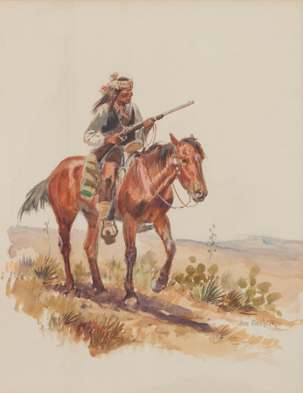 Untitled (Native Scout on Horseback), watercolor on paper, signed Joe Beeler (lower right)