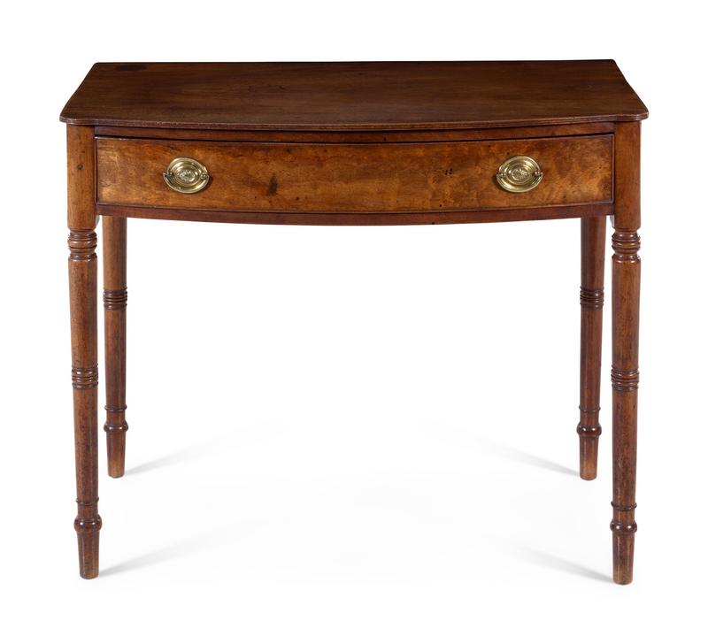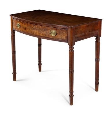 having a rectangular top with bowed front over a single drawer, raised on ring turned legs.
