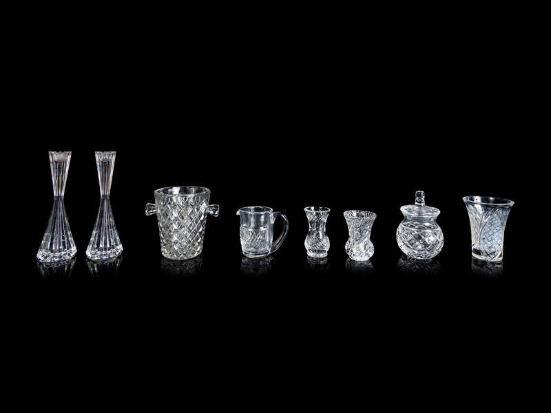 comprising a pair of candlesticks, three vases, a pitcher, an ice bucket and a jar; 8 items total.