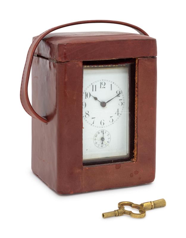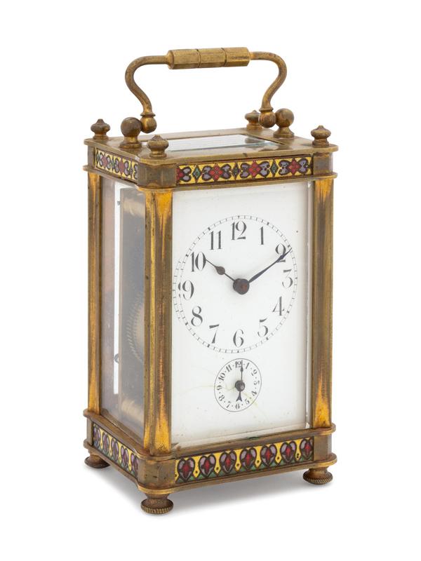A French Brass and Champleve Enamel Carriage Clock with a Leather Case