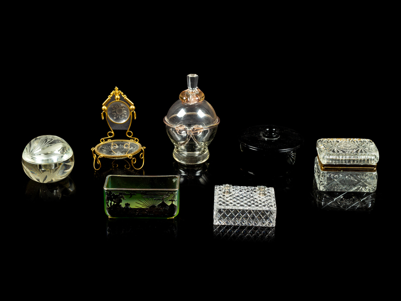 comprising a stoppered bottle, a wheel cut paperweight, a silver overlay bowl, a gilt metal mounted throne and three boxes.