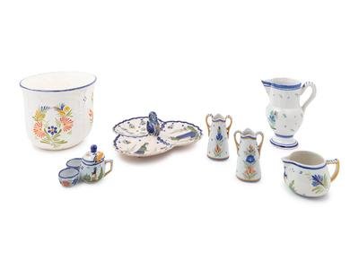 Comprising a jardiniere, a pitcher, a creamer, a pair of two-handled vases, a trefoil dish and a mustard pot.