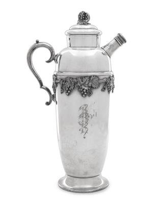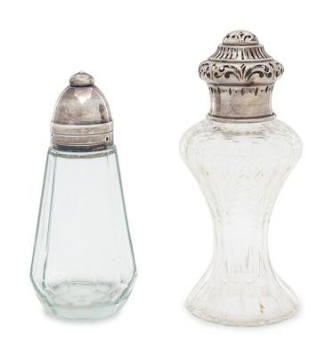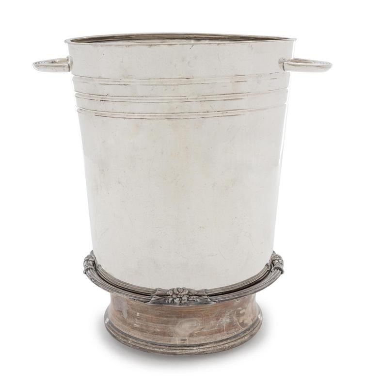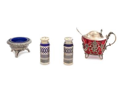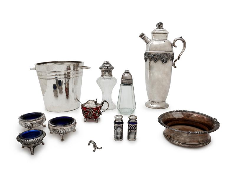 comprising a Christofle silver-plate mounted glass bottle, cocktail shaker, wine cooler, wine bottle coaster, three salt cellars, pair of casters and mustard pot together with a silver-mounted glass muffineer.
