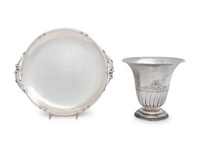 comprising a J. Wagner & Sons serving dish, Birks Silver Co. tazza, Tuttle Silversmiths vase, Dingwall sugar basket, Gorham nut dish, English bread dish and sauce boat, caster, salt cellar, three weighted candlesticks and a weighted vase, together with a silver-plate ice bucket.