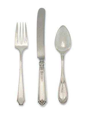 comprising a set of 12 Whiting Mfg. Co. salad forks, 12 Towle iced tea spoons, 12 Gorham Mfg. Co. luncheon forks and teaspoons and 9 Tiffany & Co. demitasse spoons, together with 52 other associated silver and silver-plate flatware articles.