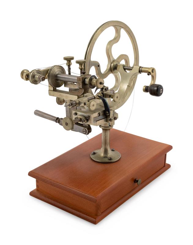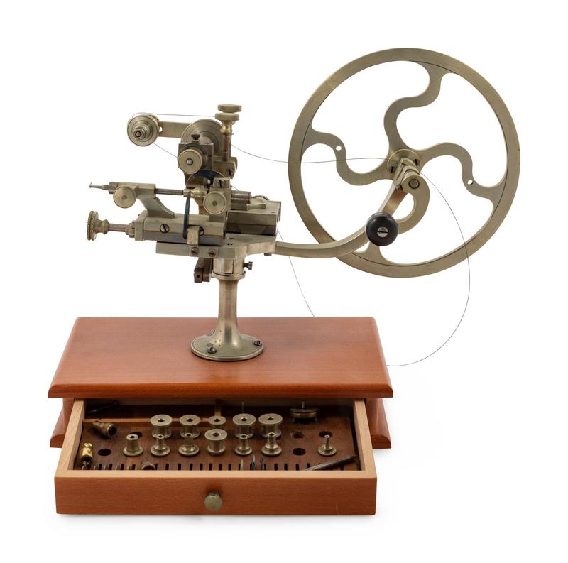 mounted to a wood base, the base drawer with extra bits and cutting wheels.